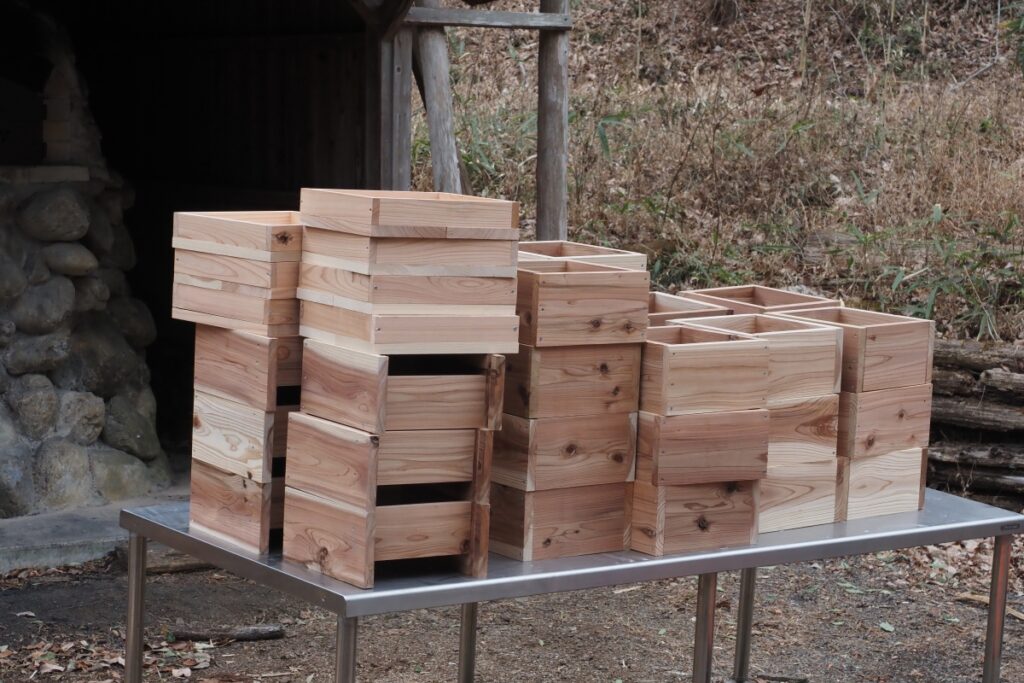 朝9時半から初めて、お昼休憩をはさんで、午後3時ごろまで作業して、参加者全員がなんとか1組の重箱巣箱を作り上げることができました。もちろん、こういう作業が得意な人、苦手な人で、一人が作れた箱の数は違います。でも、得意な人は苦手な人の分まで多めに作って、結果的に5段×6組の巣箱ができたのです。インパクトドライバーの練習から始まって、午後にはここまでできてしまうんだから、人間って成長するもんですね。