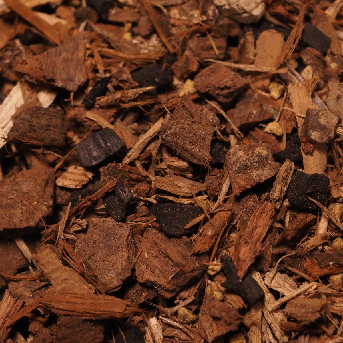 原材料には、細かく砕いた国産広葉樹樹皮を使用しています。腐熟度が異なる樹皮をブレンドすることで、共生菌の早期定着を促すとともに、2年の植え替えサイクルの間、常時、菌の栄養源となる新鮮な有機物が供給されるよう工夫しています。