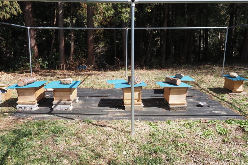巣門を板でふさいで8cmほどに狭めた以外に、冬囲い等の特殊な防寒処理はしていません。セイヨウミツバチは寒さには適応しているので、埼玉の山間部の気温ならば防寒処理はいりません。(後述しますが、自然巣で飼育し、かつ化学合成殺ダニ剤を使わないと、耐寒性がさらに上がるのではと思っています。)