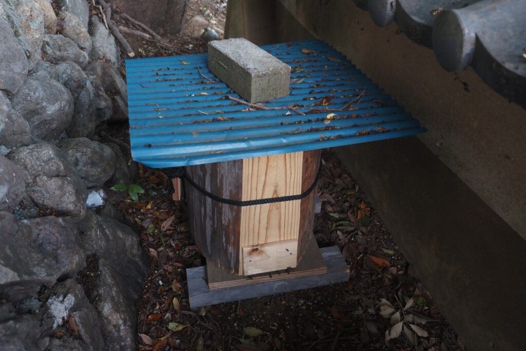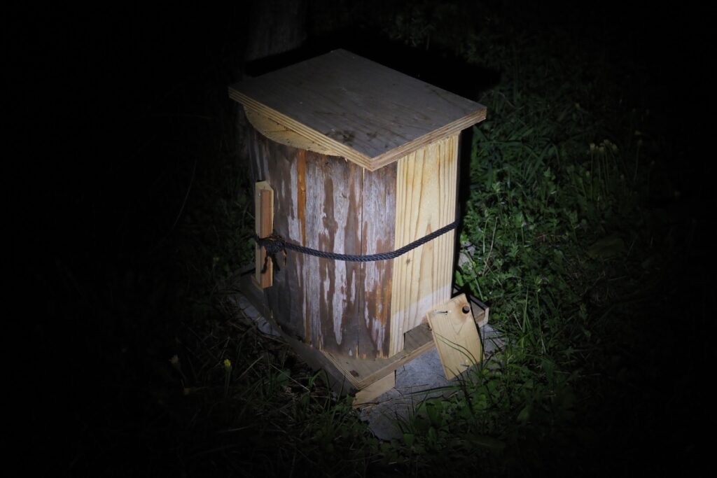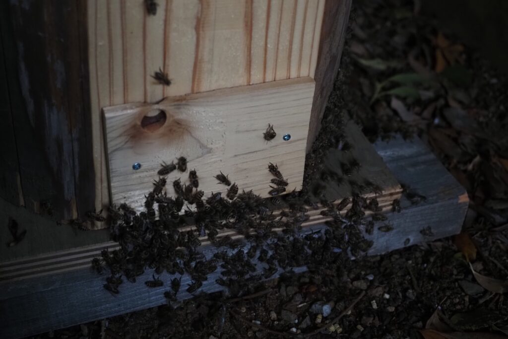 本日、入居から6日経ち、そろそろ巣枠が何枚かできているタイミングなので、飼育箱を持ってお寺に行ってきました。時刻は外勤蜂がほとんど巣に帰っている午後6時ごろです。