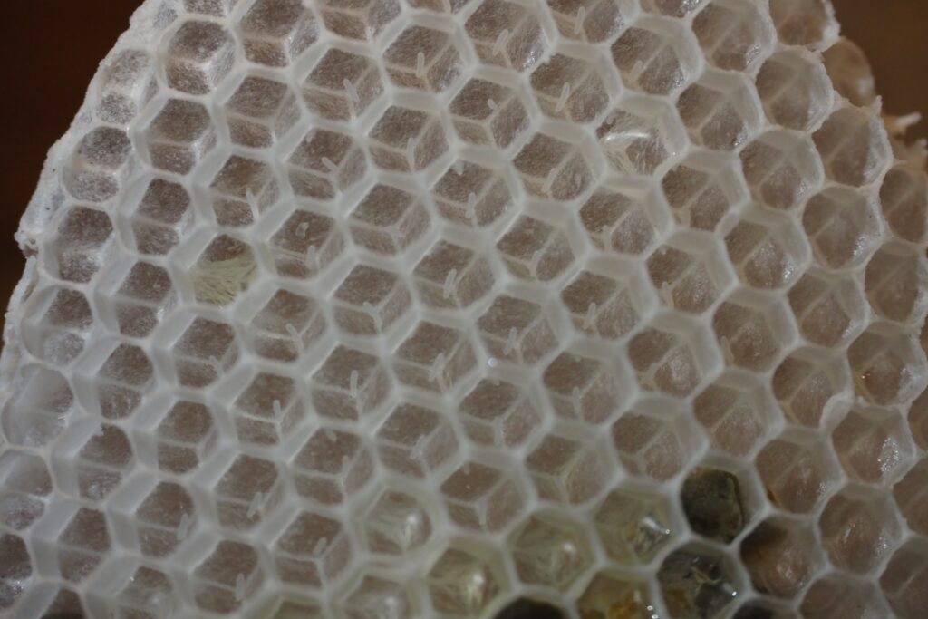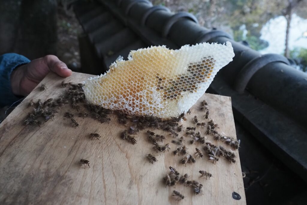 今回、無駄巣2枚のほかには、4枚の巣板が巣枠内にきれいに成形されていました。それだけに、この失敗はだいぶ悔しい。