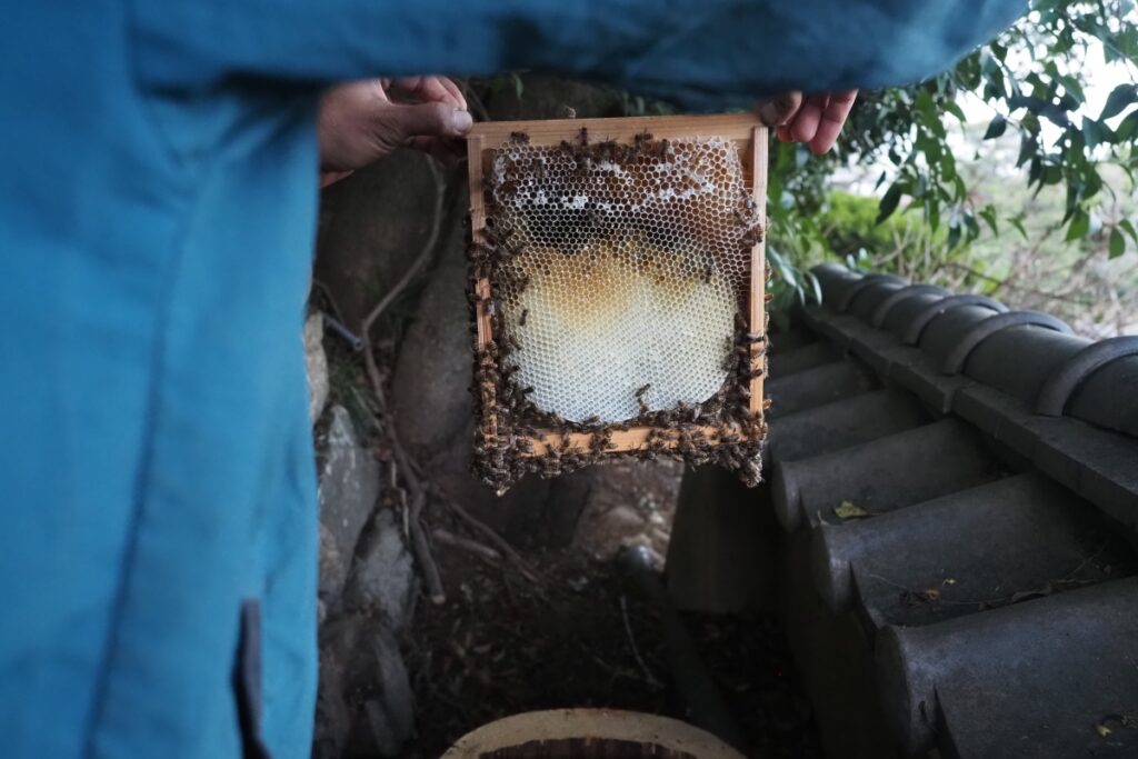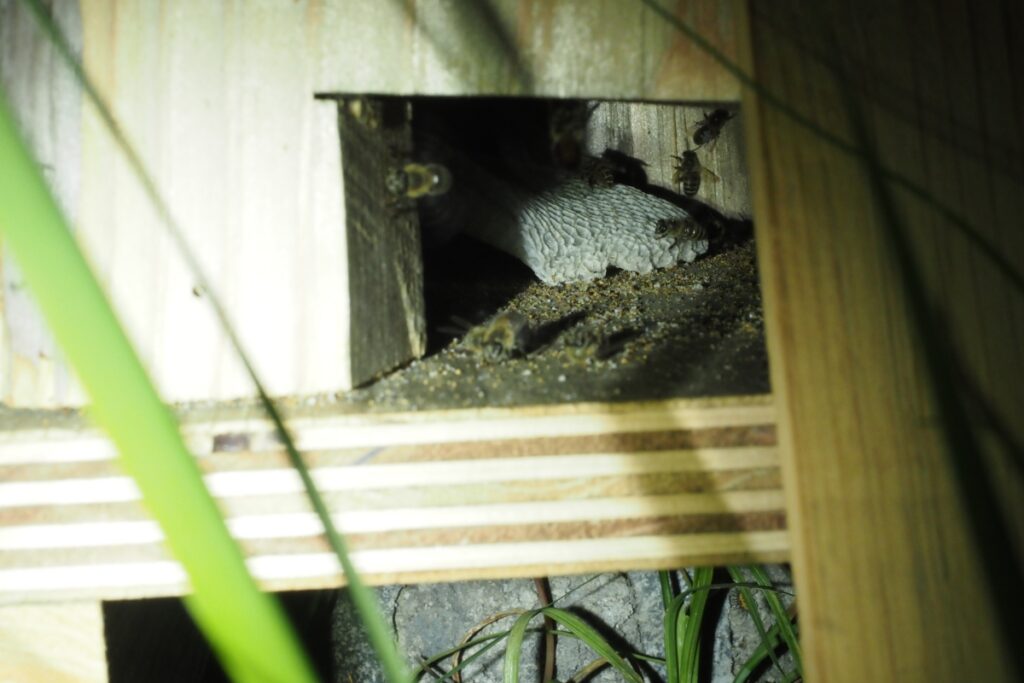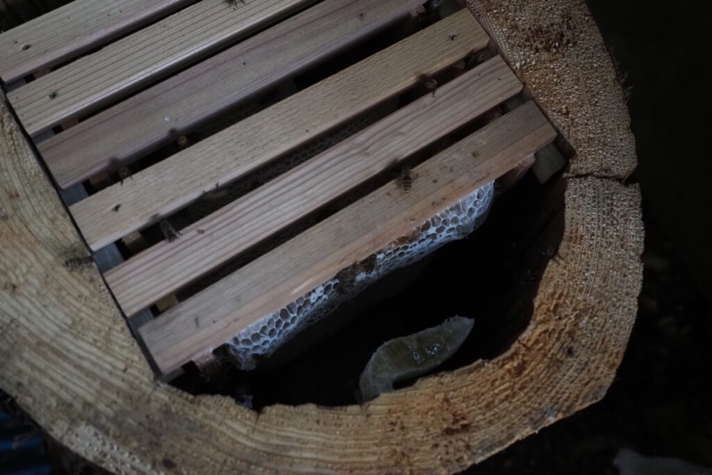 このとき、ライトで巣の中を照らすと、ちぎれた巣板の下半分がありました。この落下事故に女王が巻き込まれてないことを祈るばかりです。