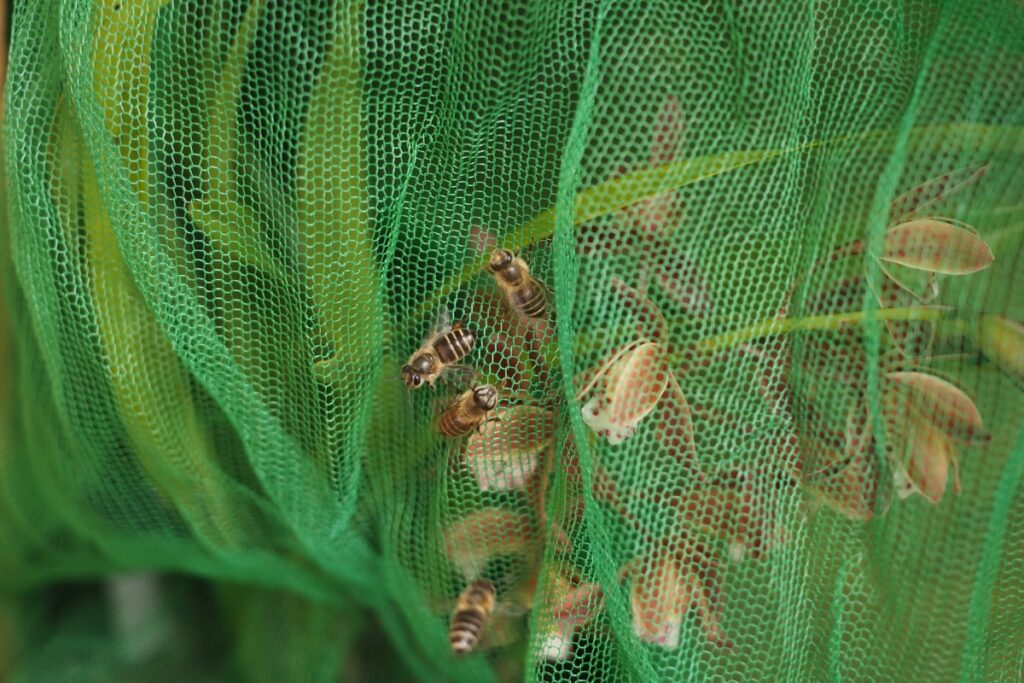 キンリョウヘンはこのように鉢ごとすっぽり入るネットに入れて巣箱の真横に置きます。みつばちによって受粉が成功してしまうと、その花茎の他の花はしおれて誘引力を失ってしまうからです。また、受粉によって実をつけたキンリョウヘンは、種子生産に体力を使うので、その後の新芽の発達が遅れます。ミツバチ誘引に使う場合、実は着かせてはならないのです。