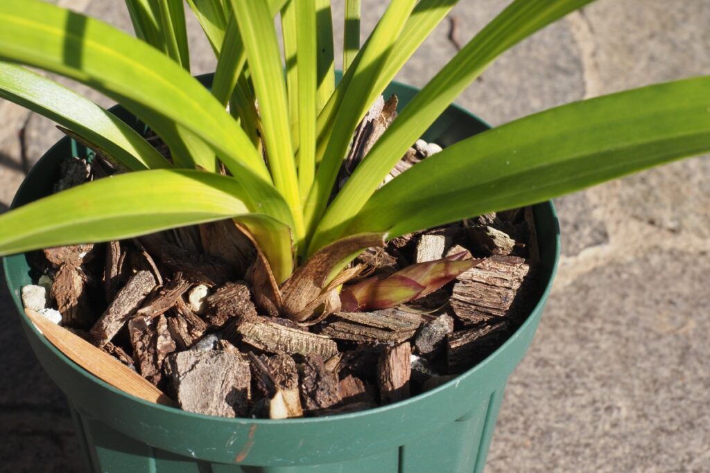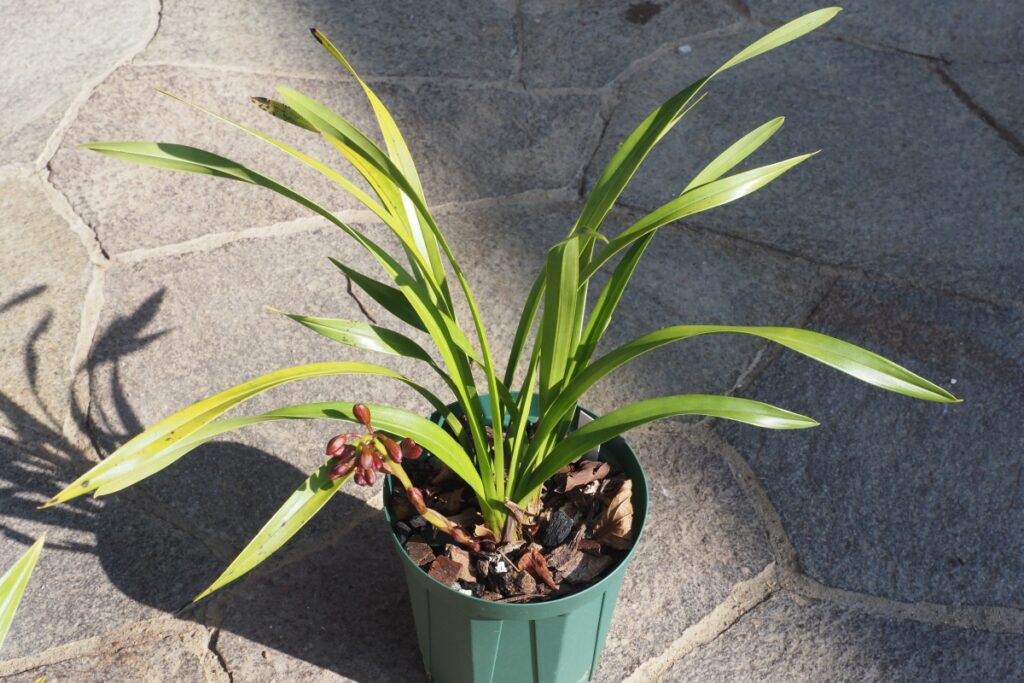 品種によっても異なりますが、当園の標準品の場合、春に以下の写真のような状態になる規格の鉢が届きます。花芽は1~2個です。(撮影日は3/20)